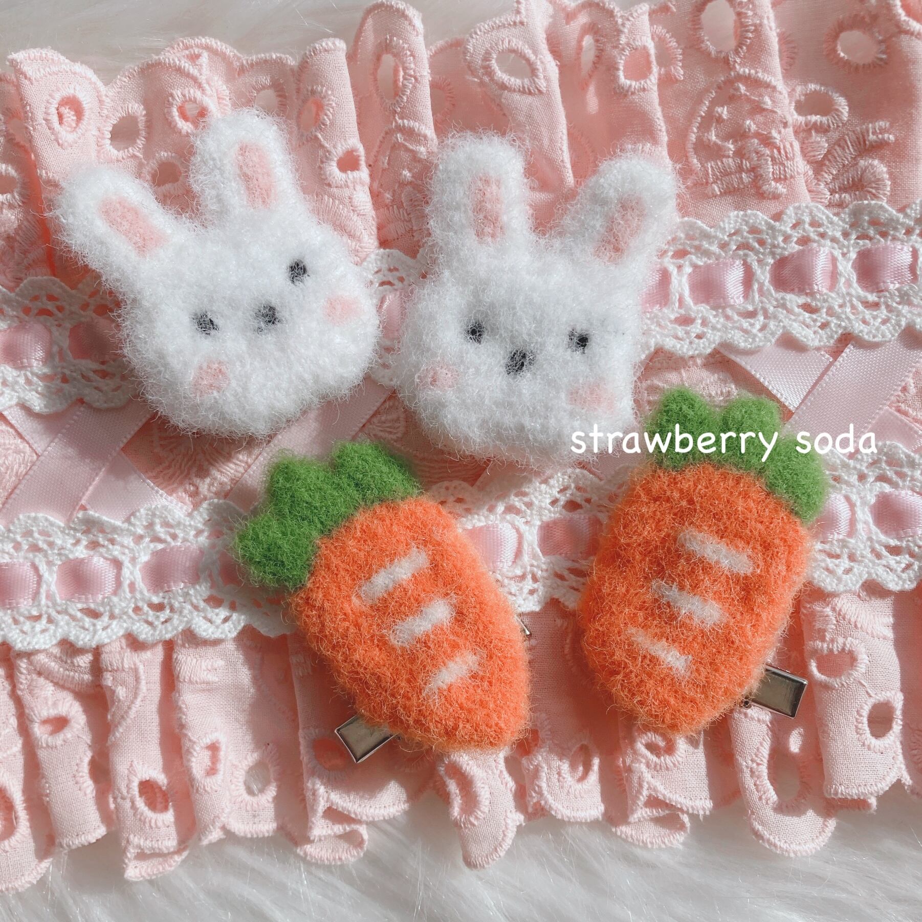 フワフワのうさちゃん・いちご・にんじんの可愛いヘアクリップᙏ̤̫͚ 単品でつけたりセットでつけたり色々なアレンジが楽しめます.•♬