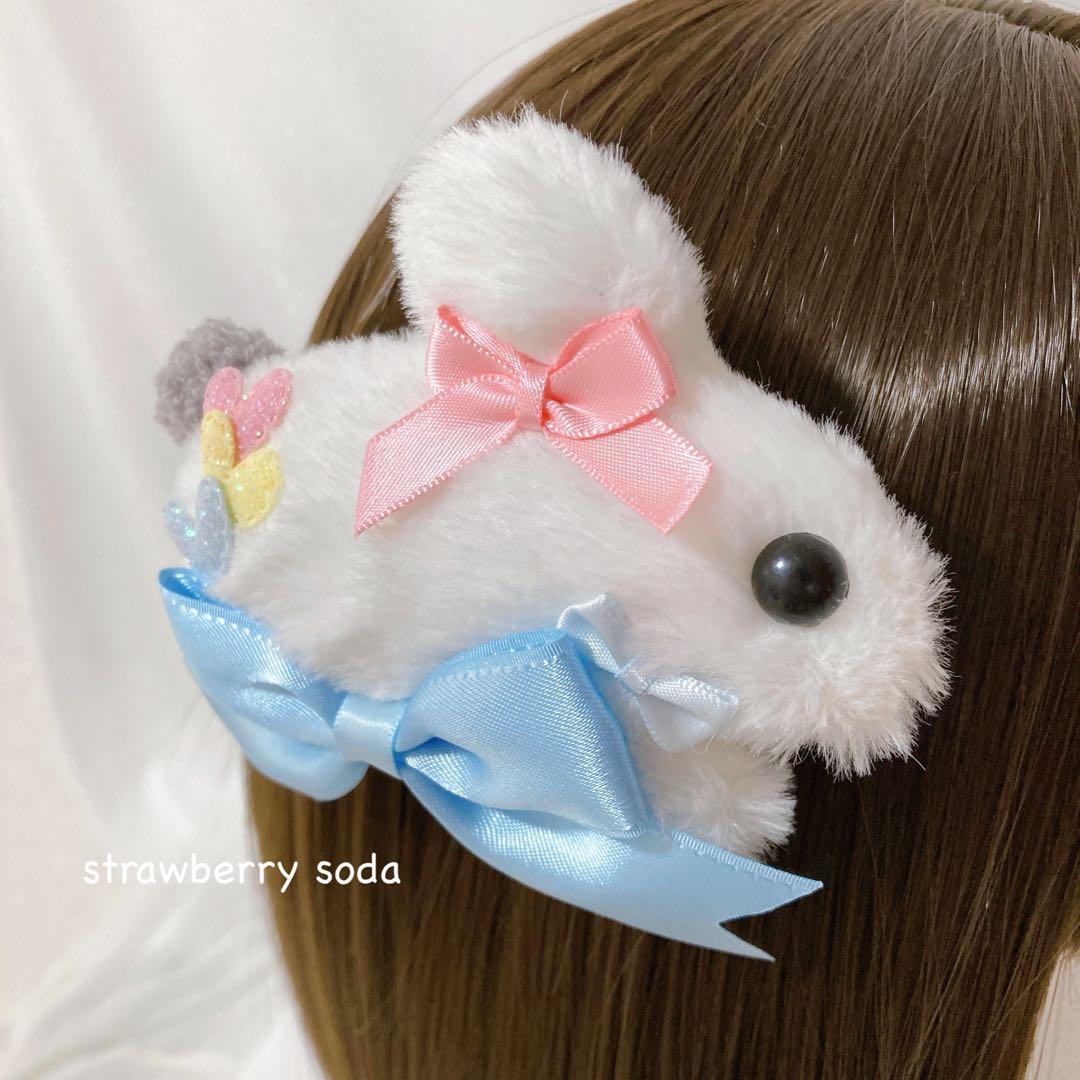 可愛いパーツで装飾されたふわふわウサちゃんのヘアクリップ₍ ᐢ. ̫ .ᐢ ₎୨୧⑅* 安全ピンも付いているので、お洋服やバッグにも装着出来ます♪*゜