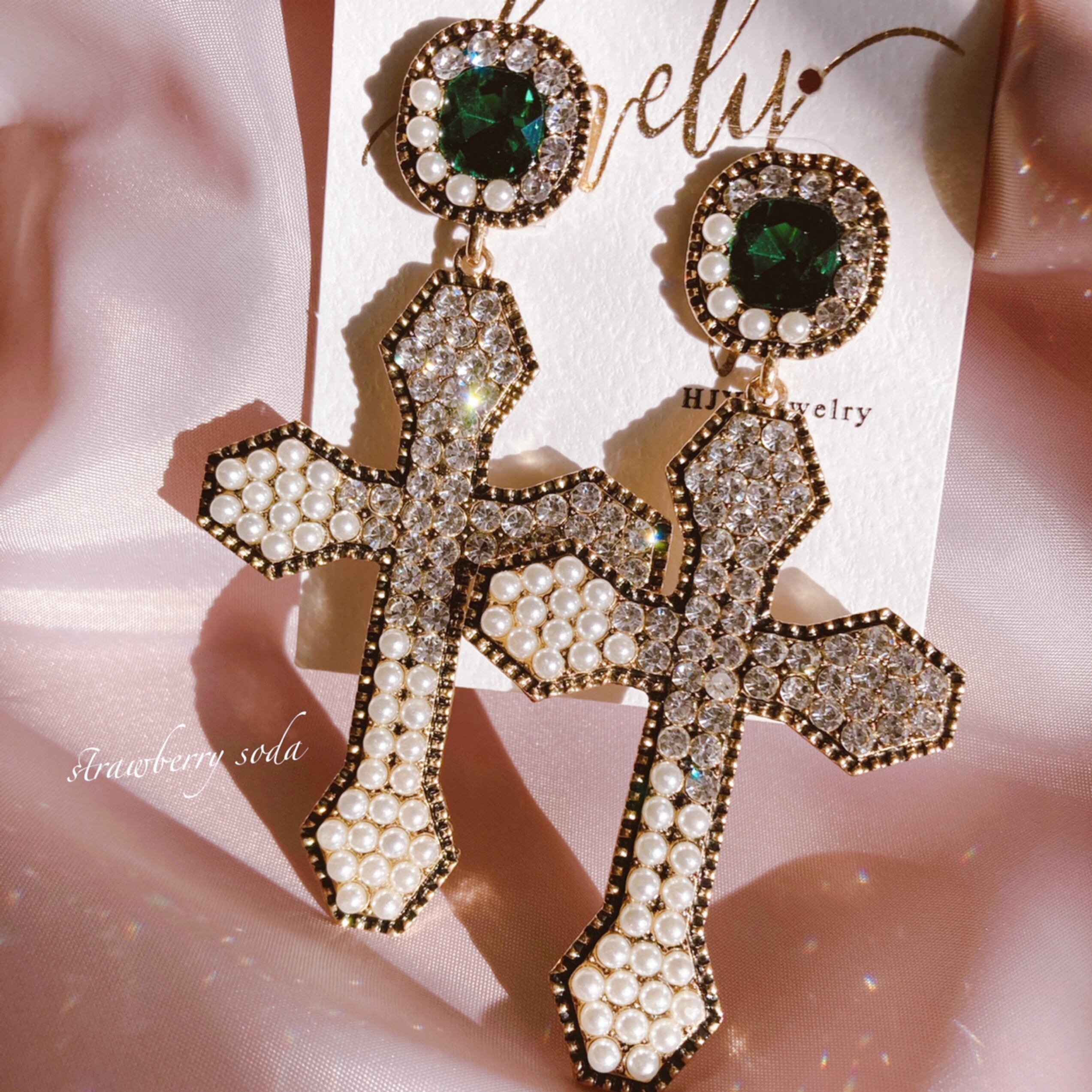 グリーンビジュー ラインストーン パール バロック調 十字架 ピアス&イヤリング
