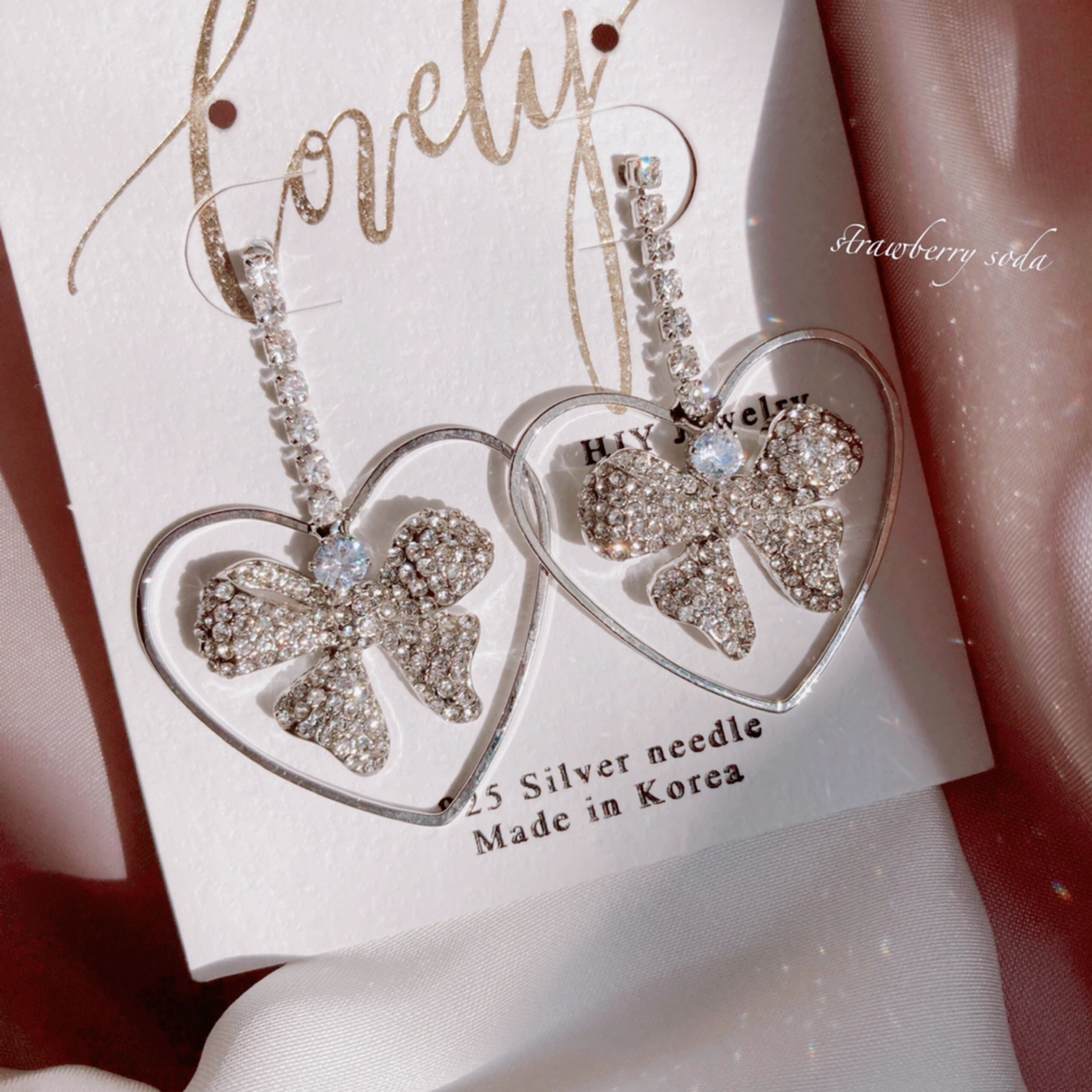 ハート フープ ラインストーン キラキラ リボン ピアス&イヤリング