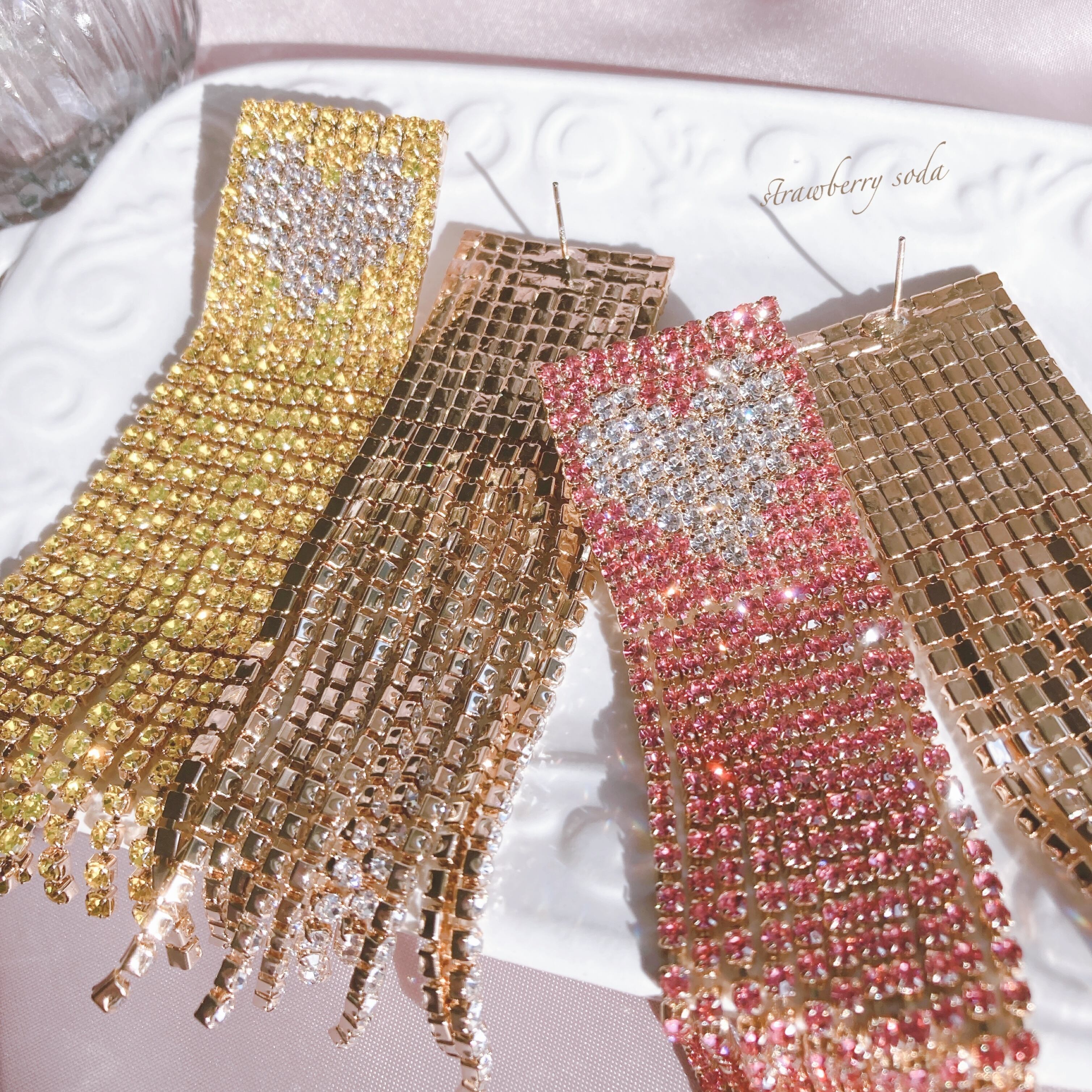 イエロー ピンク クリア ハート ラインストーン タッセル ピアス